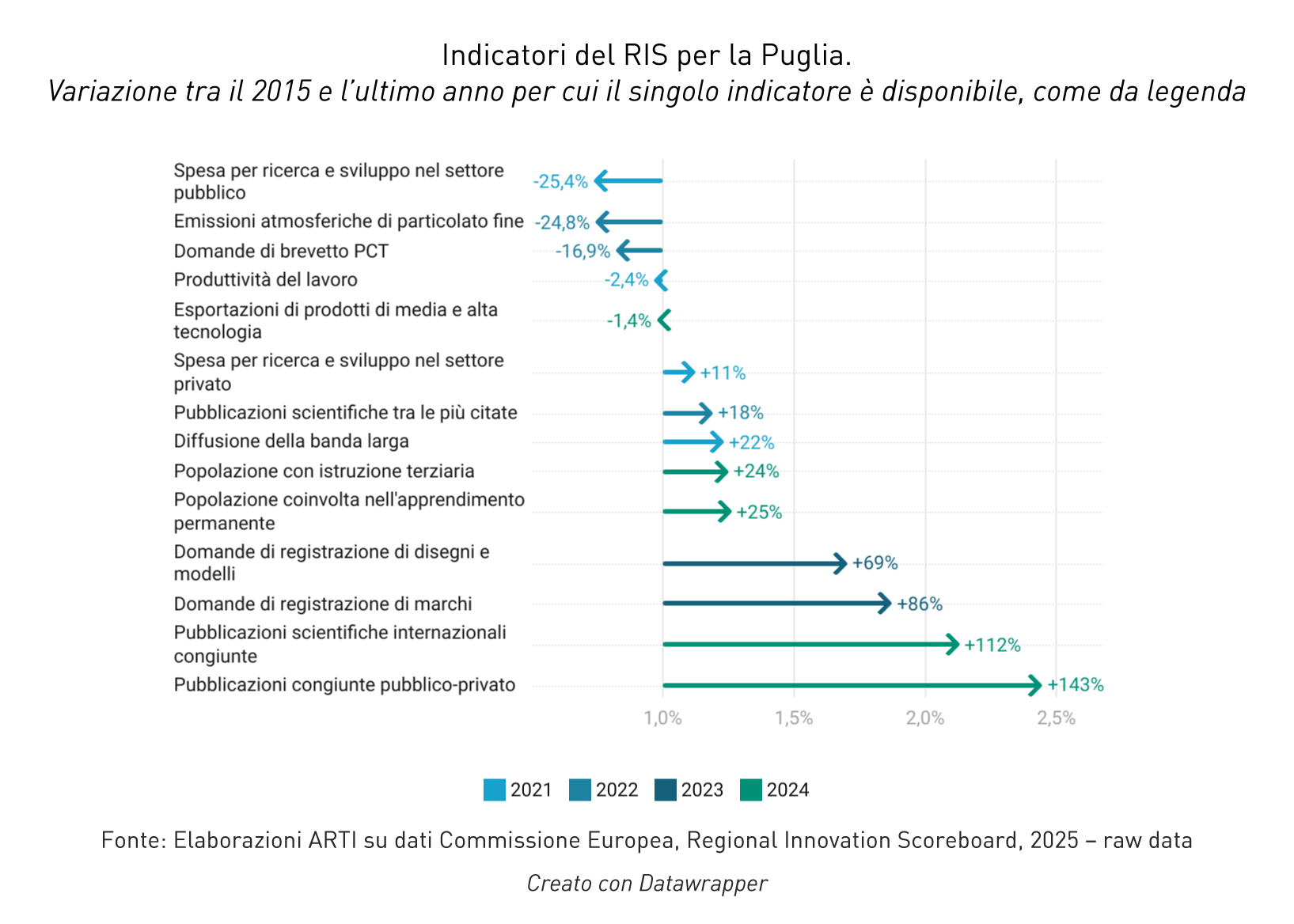Partendo dalle statistiche disponibili per la Puglia, è stato costruito un arrow plot per rappresentare le variazioni tra il 2015 e l’ultimo anno per cui il singolo indicatore è disponibile (come indicato in legenda).